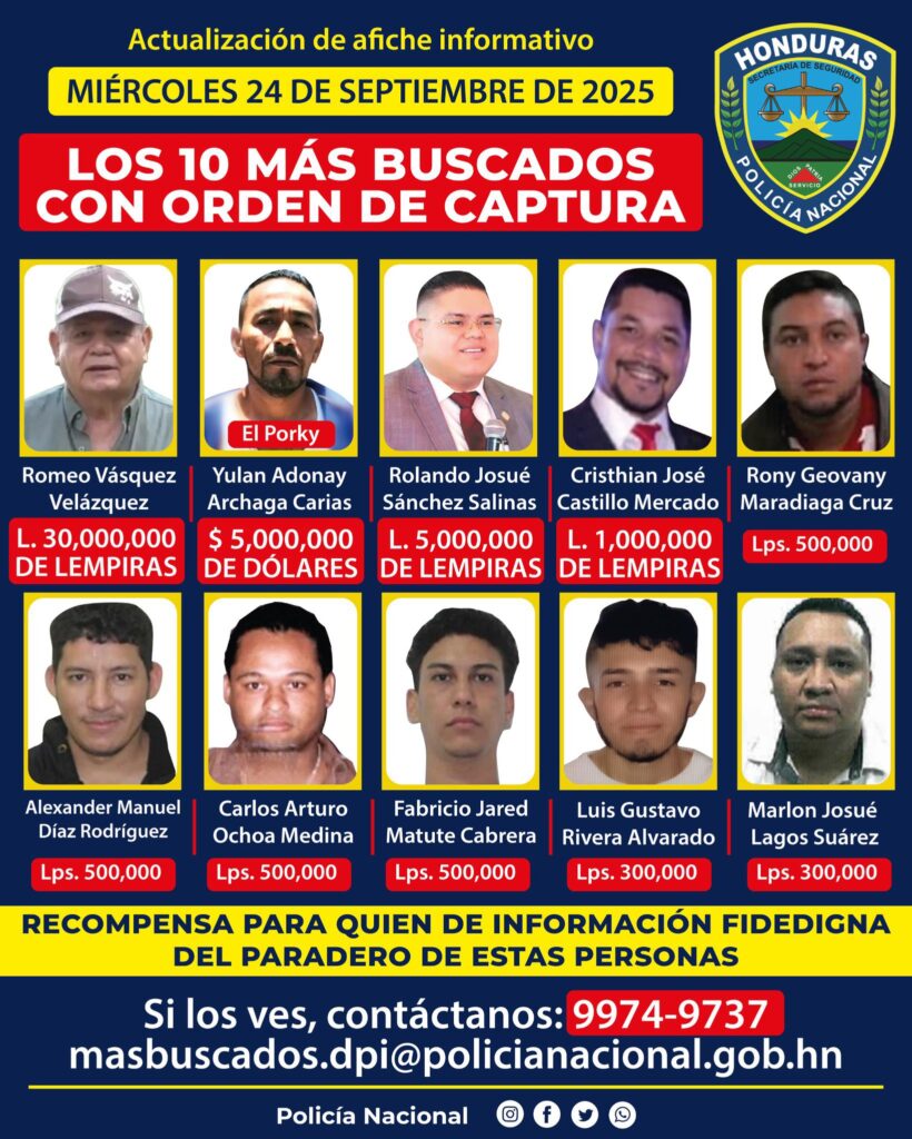 El monto pasó de 25 a 30 millones de lempiras, la cifra más alta establecida hasta la fecha en el país.La recompensa se fijó inicialmente en marzo de 2025 en 500 mil lempiras y, desde entonces, ha venido aumentando de forma progresiva: primero a 1 millón, luego a 2 millones, 3 millones, 3.5 millones, 5 millones, 10 millones, posteriormente 15 millones el 31 de julio, después 20 millones el 18 de agosto, y 25 millones el pasado 5 de septiembre. Con el anuncio de hoy, el monto llega a 30 millones de lempiras, el más alto ofrecido en la historia del país por la captura de un individuo. VC