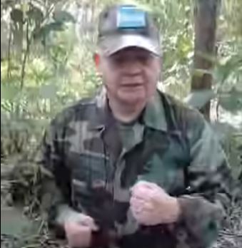 Vásquez Velásquez aparece en medio de un bosque, portando su fatiga militar y marchando al son de Patria mía.