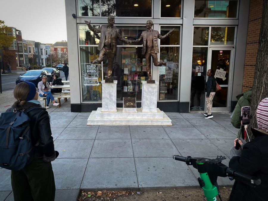 Una estatua de 3.6 metros que muestra al presidente de los Estados Unidos, Donald Trump y el fallecido delincuente sexual Jeffrey Epstein tomados de la mano volvió a aparecer un día después de la polémica por los 20,000 documentos publicados por el Congreso, donde Epstein asegura que el mandatario sabía de sus crímenes y que pasó «horas» con una de las víctimas. EFE/ David Toro