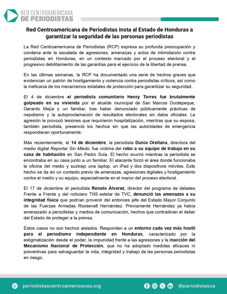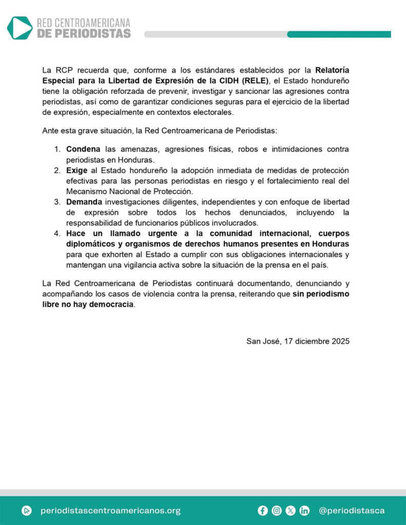 Tegucigalpa – La Red Centroamericana de Periodistas expresó su profunda preocupación y condenó la escalada de agresiones, amenazas y actos de intimidación contra periodistas en Honduras.
