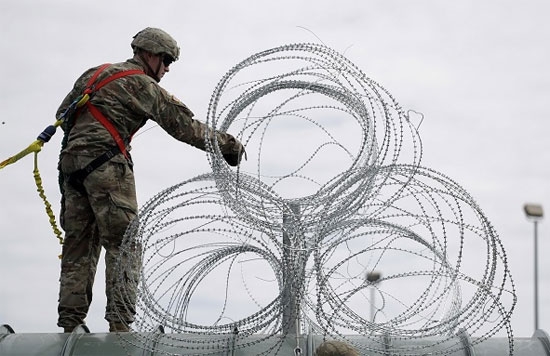 Durante la jornada de hoy, una unidad de ingenieros de los Marines colocó alambradas en la valla aledaña al cruce peatonal en San Ysidro, con la intención de «hacer ese muro menos escalable», comentó Walker.