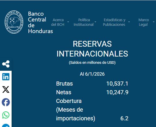 Tegucigalpa – El nivel de las Reservas Internacionales Netas (RIN) se ubicó al 6 de enero de 2026 en 10 mil 247.9 millones de dólares, con lo que cubre 6.2 meses de importación, de acuerdo a lo informado por el Banco Central de Honduras (BCH) en su portal web.