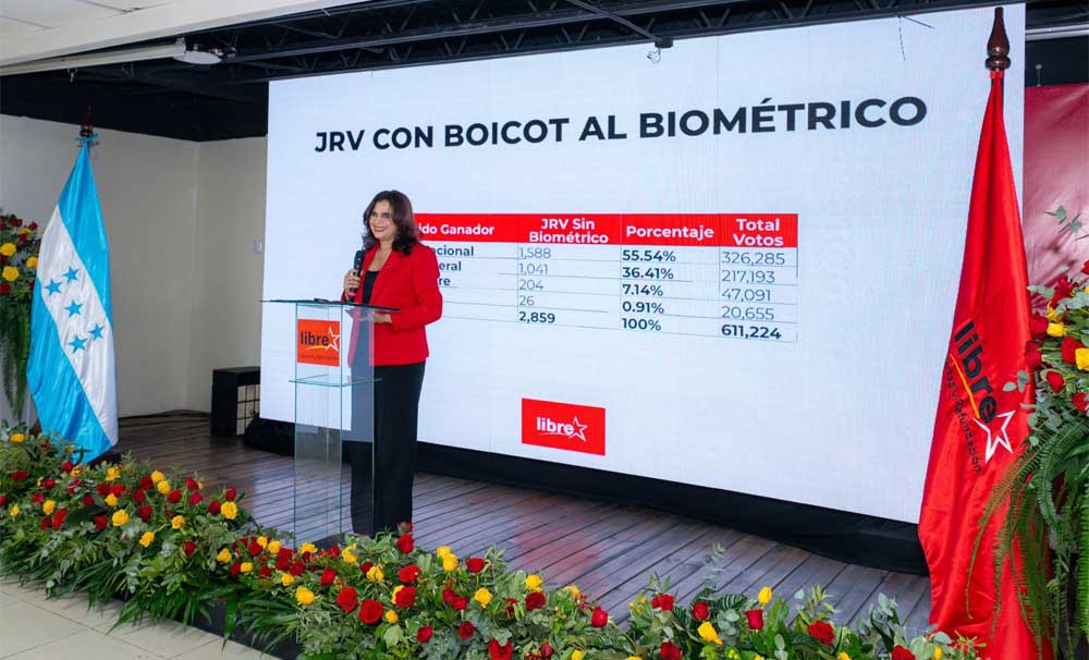 “Las elecciones no están perdidas, el bipartidismo nos impuso su trama electoral siguiendo la trampa develada en los 26 audios alterando el sistema de Transmisión de Resultados Electorales Preliminares y la biometría”, manifestó ante simpatizantes del Partido Libre convocados en la sede ubicada en la colonia Humuya de la capital hondureña.