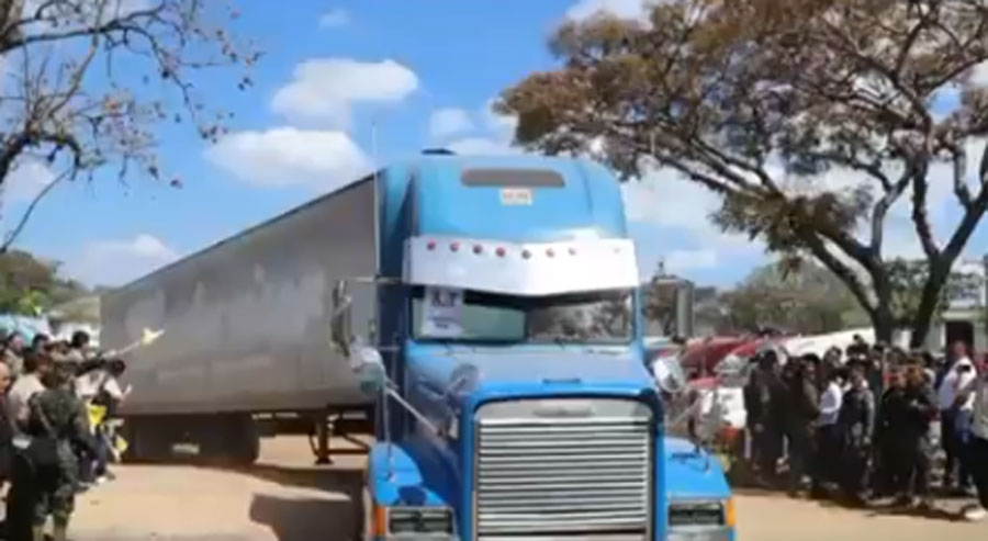Los primeros camiones que salieron de Infop, que ejerce como el centro de logística electoral del CNE donde los presentes portaban banderas de Honduras.