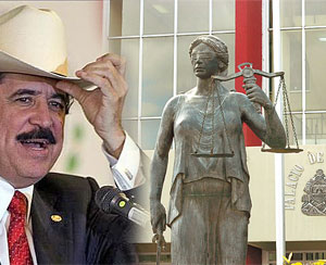 | Ello en lo concerniente al tema de la amnistía política, pero al referirse a un “retorno condicionado” de Zelaya como propone el Acuerdo de San José, el poder judicial advierte que existen acciones penales incoadas por el ministerio público y no pueden obviarse a la sombra de “acuerdos políticos” y que en apego a una estricta legalidad, “mientras no existan otras disposiciones legales aplicables, no puede eludirse que tendría (el ex presidente Zelaya y sus ex funcionarios) que someterse a los procedimientos establecidos en la legislación procesal penal”. | ![]() |