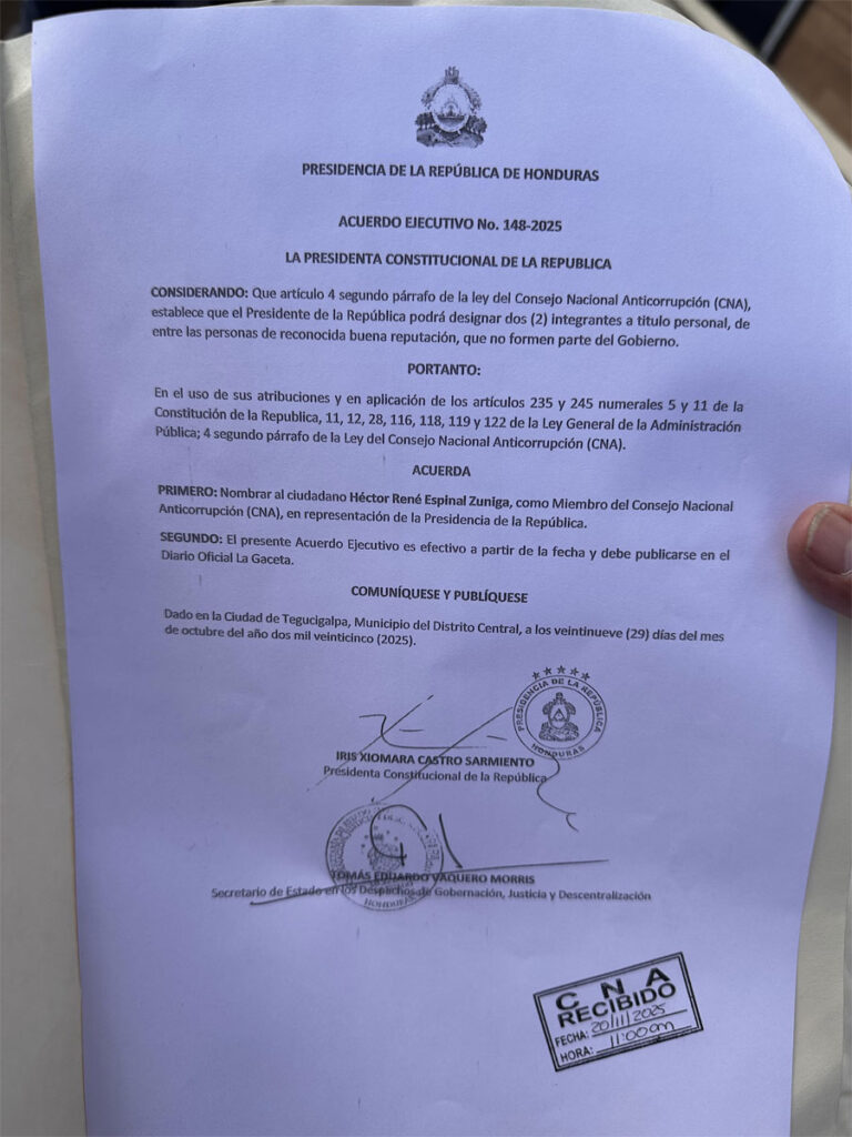 Hoy también se conoció que los hondureños Héctor Espinal y la abogada Reina Rivera Joya fueron presentados como representantes del Gobierno ante la asamblea del CNA.