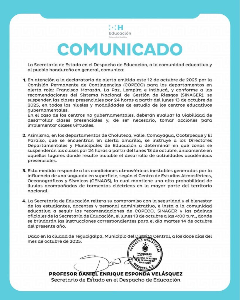 Tegucigalpa – El ministro de Educación, Daniel Esponda, informó este domingo que se determinó suspender las actividades académicas durante 48 horas en todos los municipios de los cuatro departamentos en Alerta Roja.