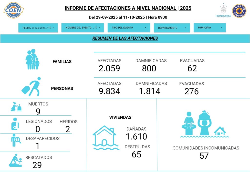 Tegucigalpa- Un total de nueve personas muertas y dos desaparecidas contabiliza la Secretaría de Gestión de Riesgos y Contingencias Nacionales (COPECO), a causa de las fuertes lluvias registradas en el territorio nacional del 29 de septiembre a la fecha.