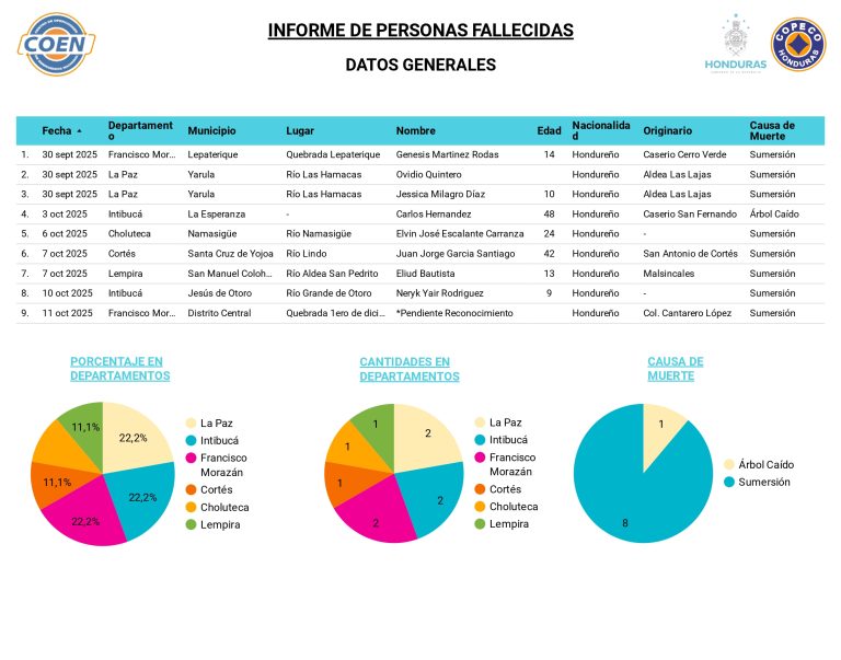 Entre las causas de muertes, Copeco señala que 8 fueron por sumersión y 1 por la caída de un árbol, siendo Francisco Morazán, Intibucá y La Paz los departamentos con mayor incidencia.