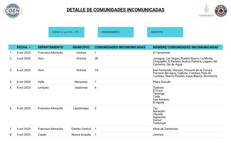 Asimismo, se emite Alerta Verde para los departamentos de El Paraíso, Copán, Yoro, Santa Bárbara, Atlántida, Colón, Cortés, Islas de la Bahía, Gracias a Dios y Olancho, por un período de 24 horas a partir de las 4:00 p.m. del viernes 10 de octubre de 2025.