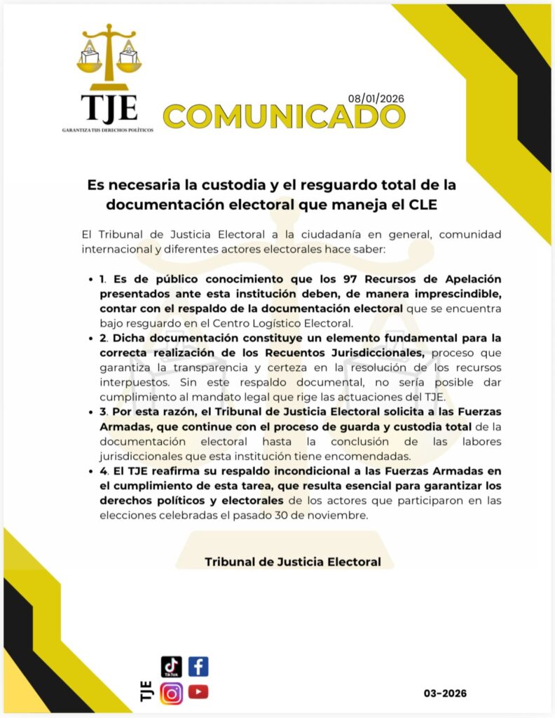 Asimismo, el TJE reiteró su respaldo incondicional a las Fuerzas Armadas en el cumplimiento de esta tarea, la cual calificó como esencial para garantizar los derechos políticos y electorales de los actores que participaron en los comicios celebrados el pasado 30 de noviembre.
