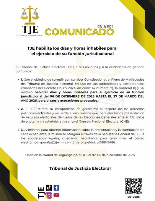Tegucigalpa– El Tribunal de Justicia Electoral resolvió habilitar días y horas inhábiles para el ejercicio de su función jurisdiccional del 06 de diciembre hasta el 27 de marzo de 2026, para plazos y actuaciones procesales.
