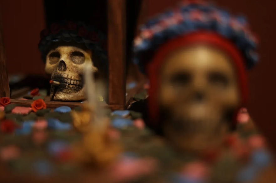 La exposición incluye reliquias familiares y elementos rituales cedidos por devotos, como cráneos decorados, urnas de vidrio, rosarios, hojas de coca y flores andinas.