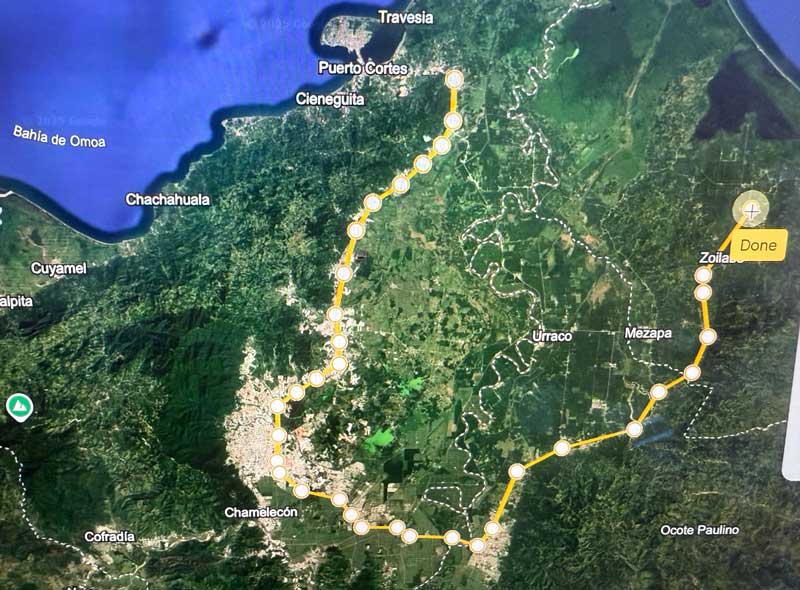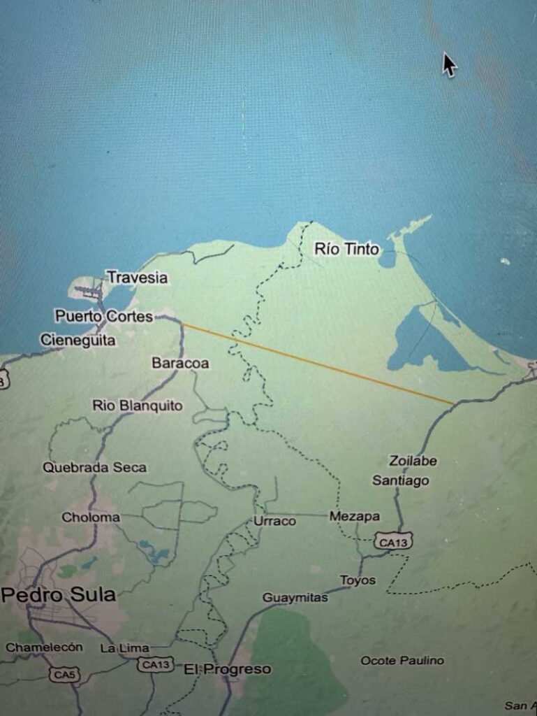 Una vía de alivio que contribuiría grandemente a evitar el problema del colapso de tránsito en el Valle de Sula y las limitantes de desarrollo del litoral atlántico sería una carretera que uniese Puerto Cortés y Tela. La misma debería comenzar a la altura de la comunidad de Concordia, a unos ocho kilómetros de la ciudad de Puerto Cortés. La imagen muestra el recorrido actual hacia el punto final propuesto.
