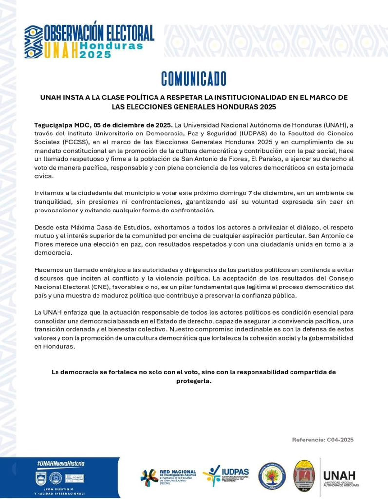Por otro lado, la UNAH invitó a la ciudadanía del municipio de San Antonio de Flores en el departamento de El Paraíso que ejerza el sufragio de manera pacífica.