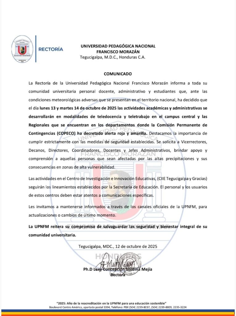 Tegucigalpa – La Universidad Nacional Autónoma de Honduras (UNAH), informó este domingo que ante las condiciones meteorológicas adversas registradas en gran parte del territorio nacional, se ha decidido suspender las actividades académicas y administrativas presenciales el lunes 13 de octubre en los departamento con Alerta Roja y Alerta Amarilla.