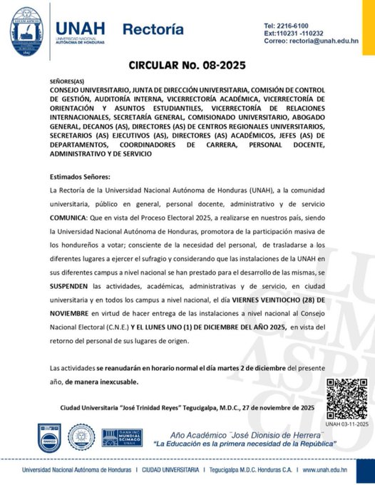 Tegucigalpa – La Universidad Nacional Autónoma de Honduras (UNAH) anunció la suspensión de actividades en Ciudad Universitaria y en todos sus campus a nivel nacional este viernes 28 de noviembre y lunes 1 de diciembre, en el marco del proceso electoral.