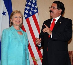 Tegucigalpa – Y el destituido Manuel Zelaya salió con una amplia sonrisa, tras su reunión con la secretaria de Estado norteamericana, Hillary Clinton, para anunciar que Estados Unidos suspendería la ayuda no humanitaria y el no reconocimiento a las elecciones en Honduras en las actuales condiciones.